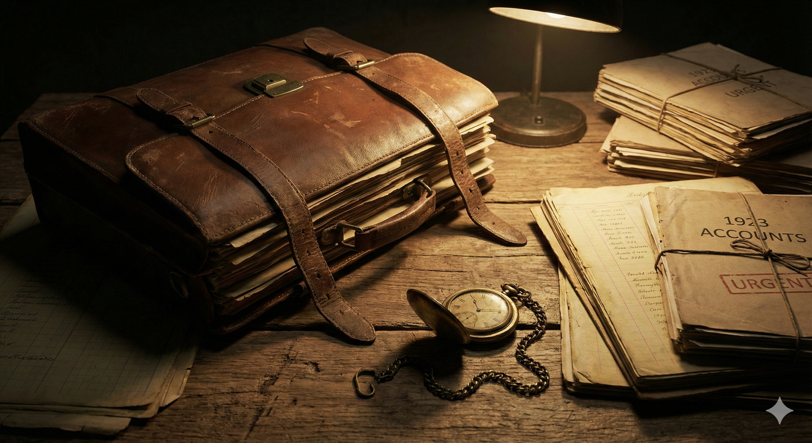 حقيبة أعمال جلدية قديمة وساعة جيب ترمز لثقل المسؤوليات وضغط الزمن في منتصف العمر، في مقال يشرح لماذا يعتبر القلق عدو الآباء.