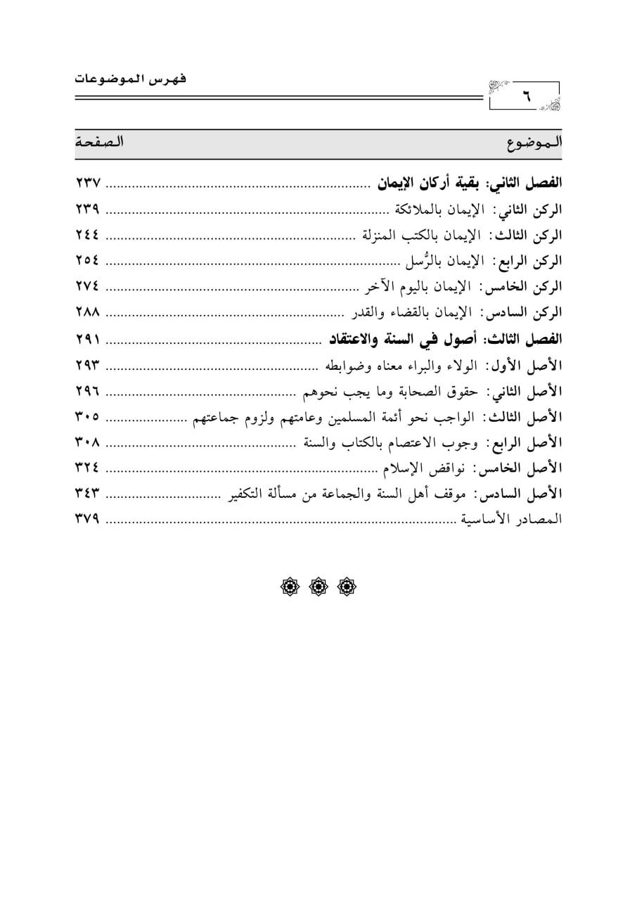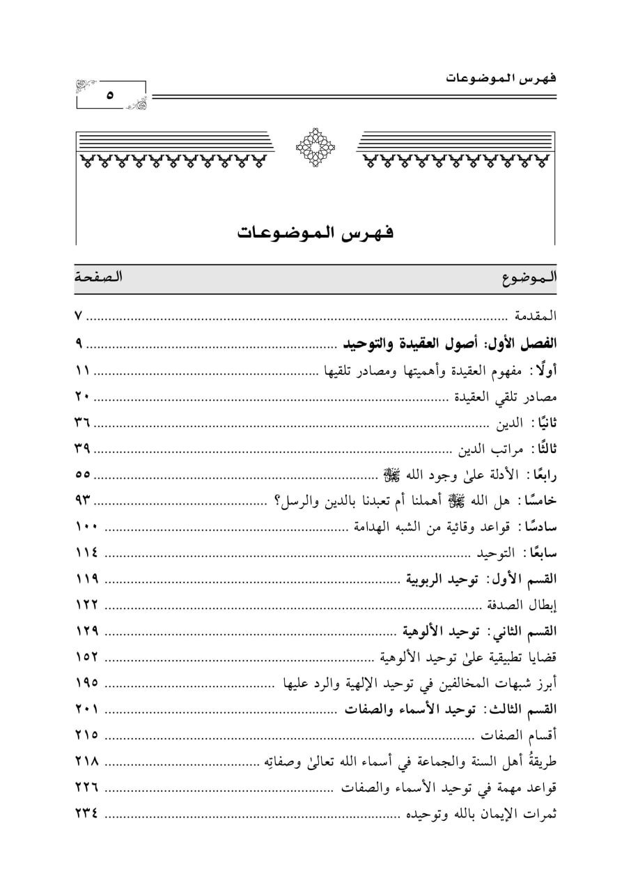 اعتنيتُ فيه بمباحث أصول الدين، المبينة لأدلة وجود الله وضرورة الرسالة، ثم مباحث الإيمان بالله وأقسام التوحيد الثلاثة، ثم بقية أركان الإيمان، ثم ستة أصول كبرى من أصول السنة والاعتقاد التي قررها علماء أهل السنة والجماعة.
